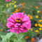 百日菊(學(xué)名:Zinnia elegans Jacq.):一年生草本。莖直立,高30-100厘米,被糙毛或長(cháng)硬毛。葉寬卵圓形或長(cháng)圓狀橢圓形,兩(liǎng)面(miàn)粗糙,下面(miàn)被密的短糙毛,基出三脈。頭狀花序單生枝端,總苞寬鍾狀;總苞片多層,寬卵形或卵狀橢圓形。舌狀花深紅色、玫瑰色、紫堇色或白色,舌片倒卵圓形,先端2-3齒裂或全緣,上面(miàn)被短毛,下面(miàn)被長(cháng)柔毛。管狀花黃色或橙色,先端裂片卵狀披針形,上面(miàn)被黃褐色密茸毛。雌花瘦果倒卵圓形,管狀花瘦果倒卵狀楔形。花期6-9月,果期7-10月。