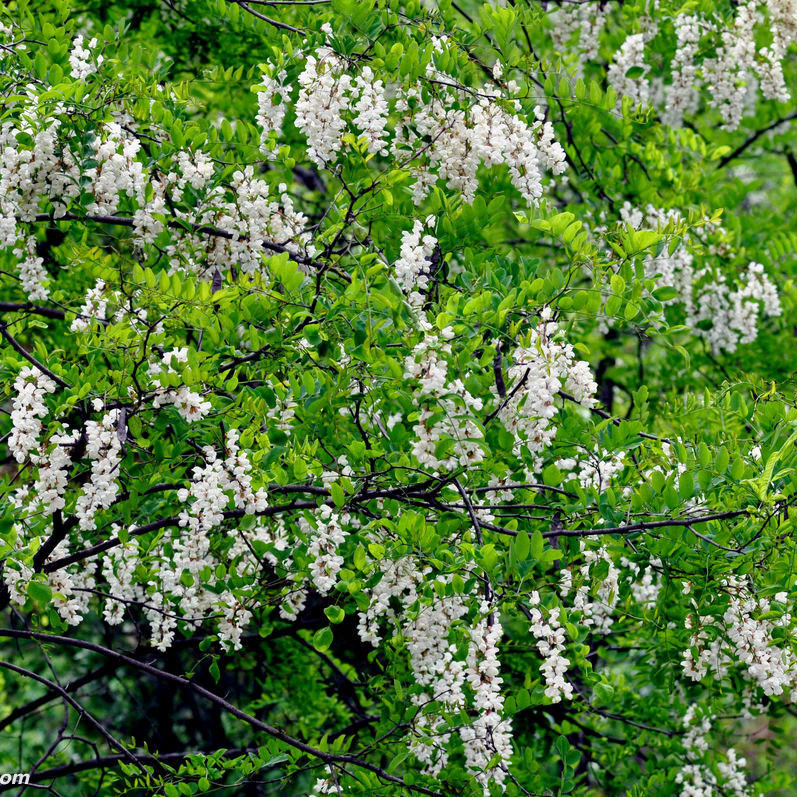 刺槐,拉丁文名:Robinia pseudoacacia L.豆科、刺槐屬落葉喬木,樹皮灰褐色至黑褐色,淺裂至深縱裂,稀光滑。原生于北美洲,現被廣泛引種(zhǒng)到亞洲、歐洲等地。刺槐樹皮厚,暗色,紋裂多;樹葉根部有一對(duì)1~2mm長(cháng)的刺;花爲白色,有香味,穗狀花序;果實爲莢果,每個果莢中有4~10粒種(zhǒng)子。刺槐木材堅硬,耐腐蝕,燃燒緩慢,熱值高。刺槐花可食用。刺槐花産的蜂蜜很甜,蜂蜜産量也高。栽培變種(zhǒng)有紅花刺槐、金葉刺槐等。
