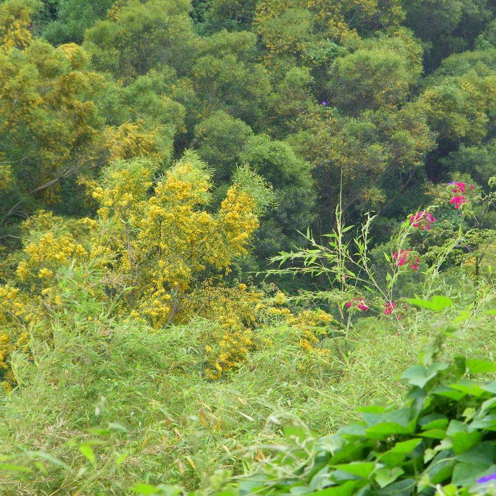 台灣相思(學(xué)名:Acacia confusa Merr.):常綠喬木,高6-15米,無毛;枝灰色或褐色,無刺,小枝纖細。苗期第一片真葉爲羽狀複葉,長(cháng)大後(hòu)小葉退化。頭狀花序球形,單生或2-3個簇生于葉腋,直徑約1厘米;總花梗纖弱,長(cháng)8-10毫米;花金黃色,有微香;花瓣淡綠色,長(cháng)約2毫米。莢果扁平,幹時(shí)深褐色,有光澤;種(zhǒng)子2-8顆,橢圓形,壓扁,長(cháng)5-7毫米。花期3-10月;果期8-12月。