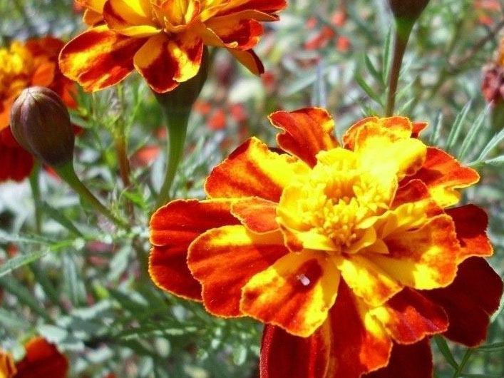 孔雀草(拉丁學(xué)名:Tagetes patula L.)菊科、萬壽菊屬一年生草本植物。莖直立,分枝斜展。葉羽狀分裂,頭狀花序單生,管狀花花冠黃色,瘦果線形,花期7-9月。